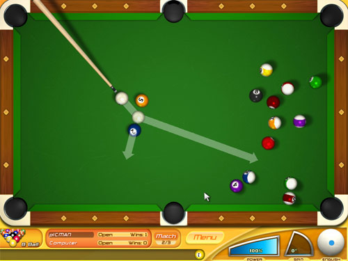• Ну первое - это всем до боли знакомая восьмерка. • Девятка. В этом виде бильярда смысл в том, чтобы загнать последним девятый шар. Остальные шары забиваются по очереди. • Европейская восьмерка. Здесь как я понял, аналог американской восьмерки, только здесь вместо сплошных и полосатых, белые - еденицы и красные - тройки. Остальное по ходу тоже самое. • Бильярд под кодовым названием "14.1". Тут нужно забивать шары по одному, одновременно заказывая и шар и лузу, в которую будет наносится удар. Выигрывает, тот у кого больше шаров забито. • Бильярд "3 шара". Здесь нужно за наименьшее количество попыток забить три шара. У кого будет меньше ударов - тот и выиграл. У меня получилось за два удара забить три шара. • Игра на время. Все просто. Игра на время. Кто быстрее забил все шары треугольника - тот и выграл. • Интересный вид игры под название "Гольф". Здесь нужно одним шаром забивать другие, минуя различные преятствия из неприкасаемых шаров