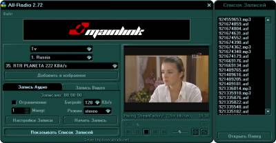 All-Radio - это программа, предназначенная для прослушивания РАДИО и просмотра ТВ на компьютере через Интернет. В программе собранные почти все РАДИО и ТВ станции, вещающие на русском языке. Все радио и телеканалы удобно сгруппированы по странам. Среди основных каналов в списке программы можно выделить: Русское радио, Радио Шансон, Радио Европа плюс, Наше радио, Радио Хит ФМ, Радио 7 на семи холмах, Радио Максимум, телеканал Мир ТВ, телеканал Рамблер ТВ, телеканал Вести, телеканал РБК ТВ и другие. All-Radio умеет работать в фоновом режиме, что позволяет заниматься другими делами на компьютере под звуки любимого радио. С All-Radio слушать интернет радио и смотреть телевизор удобно и легко. Программа представляет собой оболочку, которая взаимодействует с сервером. Уникальность программы в том, что Вам не надо обновлять программу в целях пополнения списка станций, так как при входе автоматически беруться последние списки с сервера. Некоторые станций транслируются в формате aacPlus, некоторый в OGG, для прослушивания таких станций требуется установить соответствующий плугин или кодек. На данный момент радиостанций: 2498, ТВ-станций: 1121, видео: 135